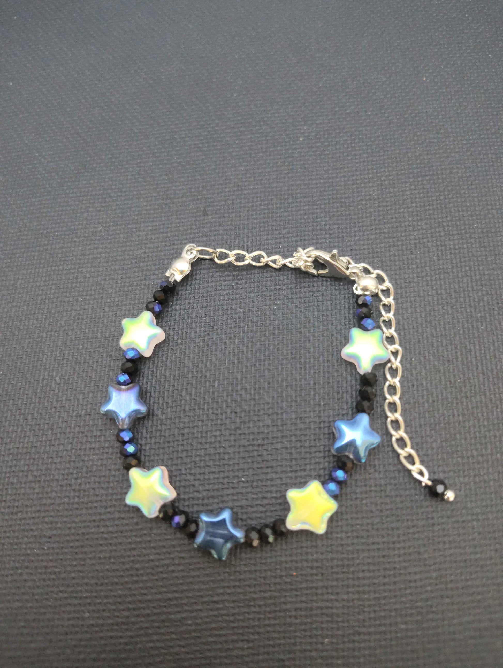 Blue and White stars strung together with dark multicolored beads. Bracelet is 5 inches long with a 3 inch chain extender