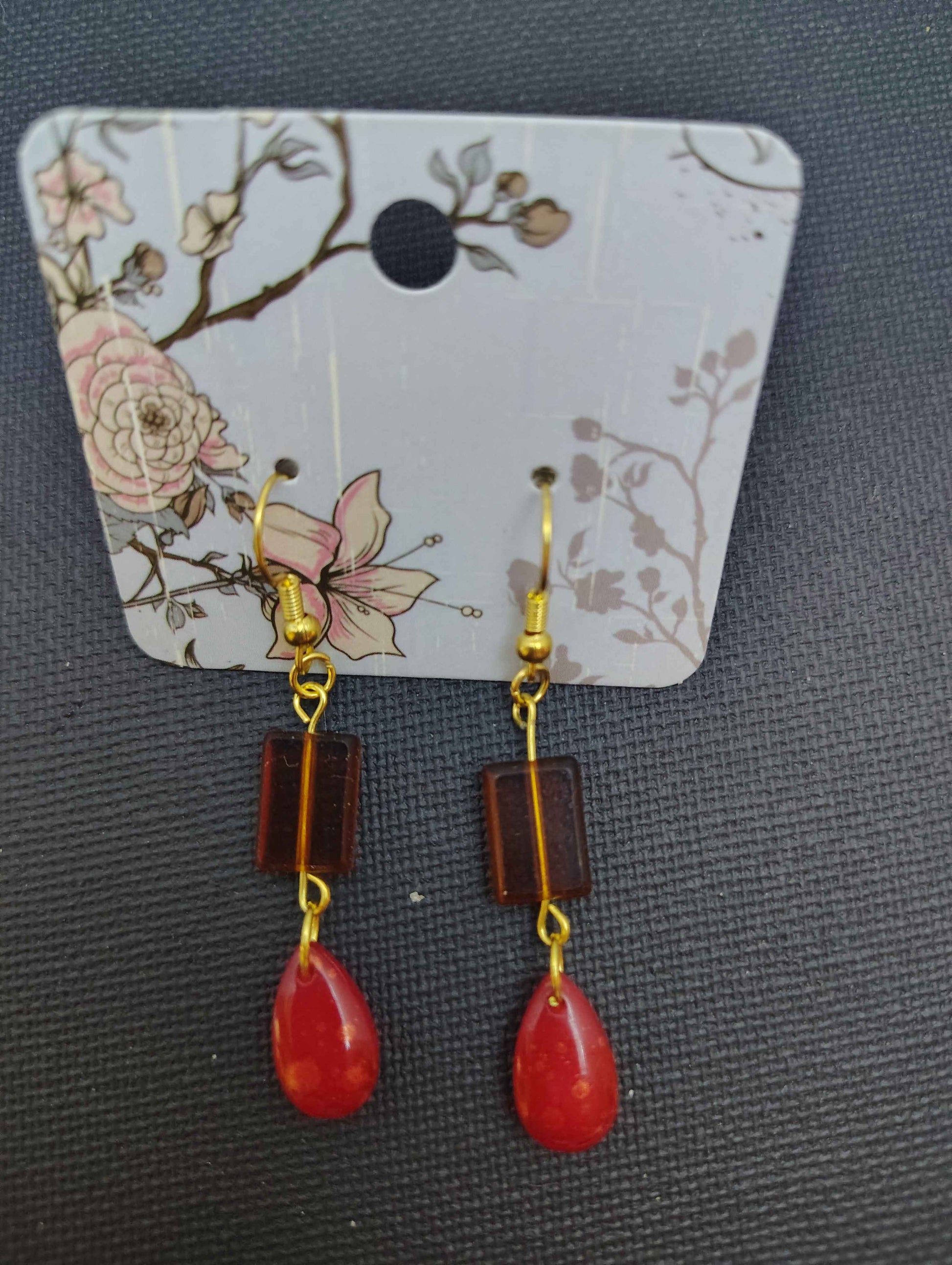 Brown rectangle with red teardrop. Earring is 1 inch long